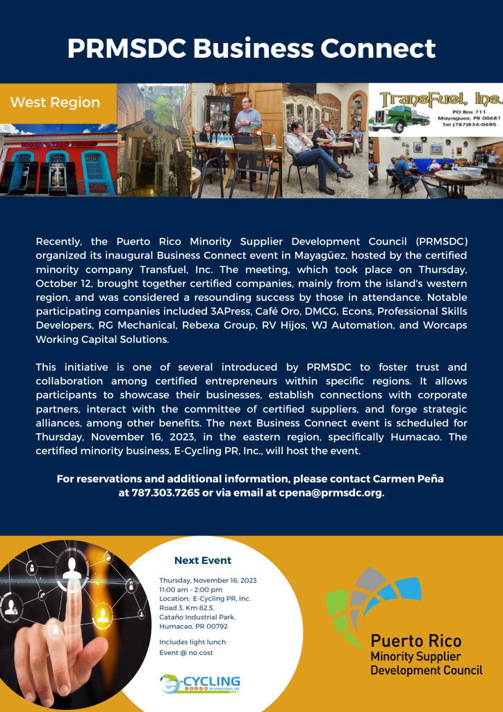 Recently, the Puerto Rico Minority Supplier Development Council (PRMSDC) organized its inaugural Business Connect event in Mayagüez, hosted by the certified minority company Transfuel, Inc. The meeting, which took place on Thursday, October 12, brought together certified companies, mainly from the island’s western region, and was considered a resounding success by those in attendance.