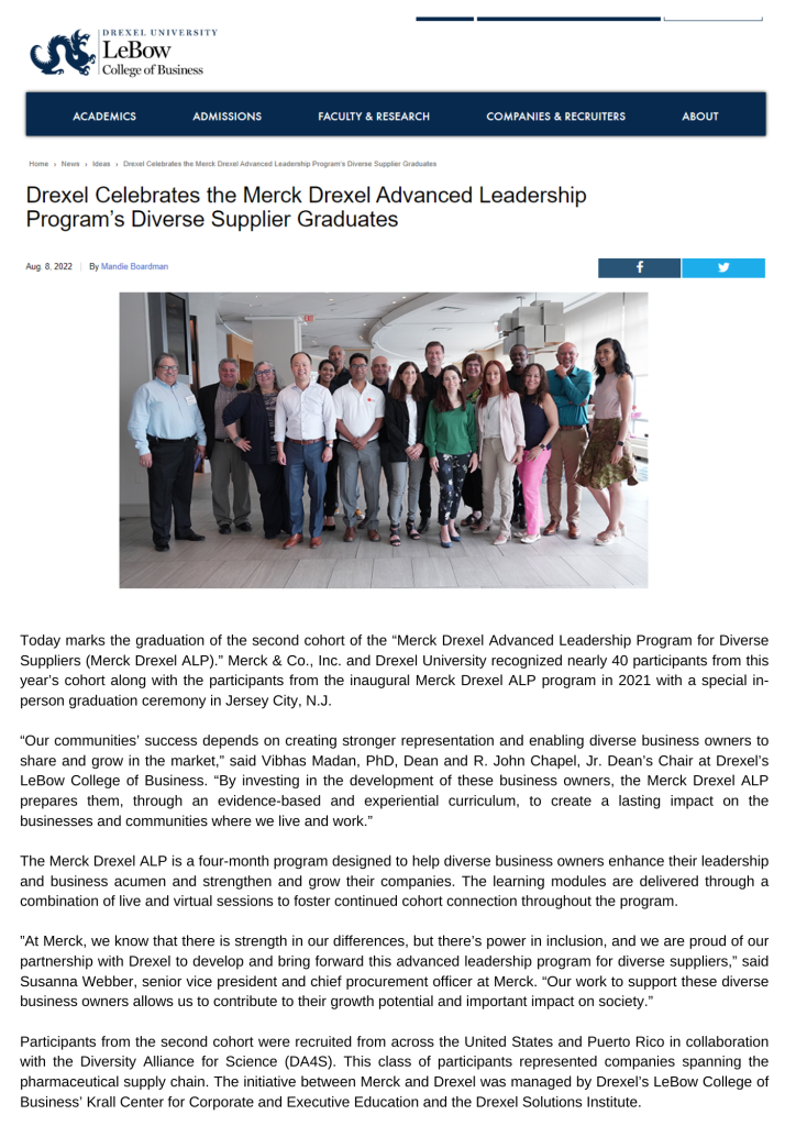 “At Merck, we know that there is strength in our differences, but there’s power in inclusion, and we are proud of our partnership with Drexel to develop and bring forward this advanced leadership program for diverse suppliers,” said Susanna Webber, senior vice president and chief procurement officer at Merck. “Our work to support these diverse business owners allows us to contribute to their growth potential and important impact on society.”